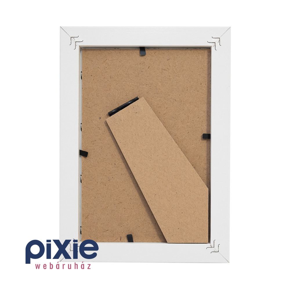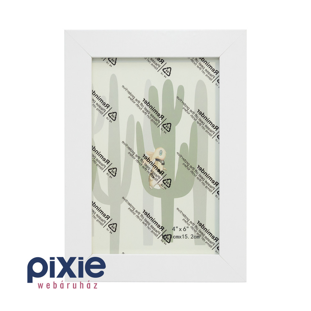 A képkeret fehér színű, fa, és műanyag anyagú, és 10cm x 15cm méretű képhez alkalmas.