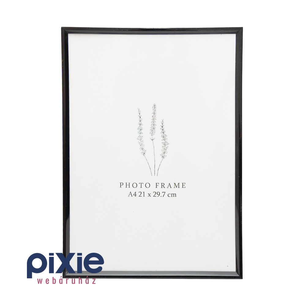Fényes fekete színű, fémhatású, letámasztható vagy falra akaszthatró képkeret.