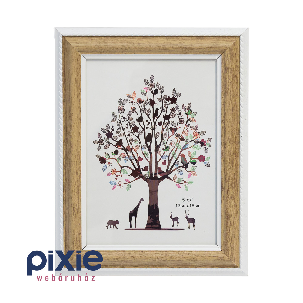 Fa hatású natúr fa és fehér színű, támasztható asztali képkeret.