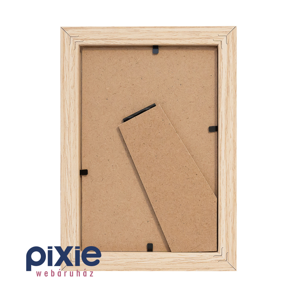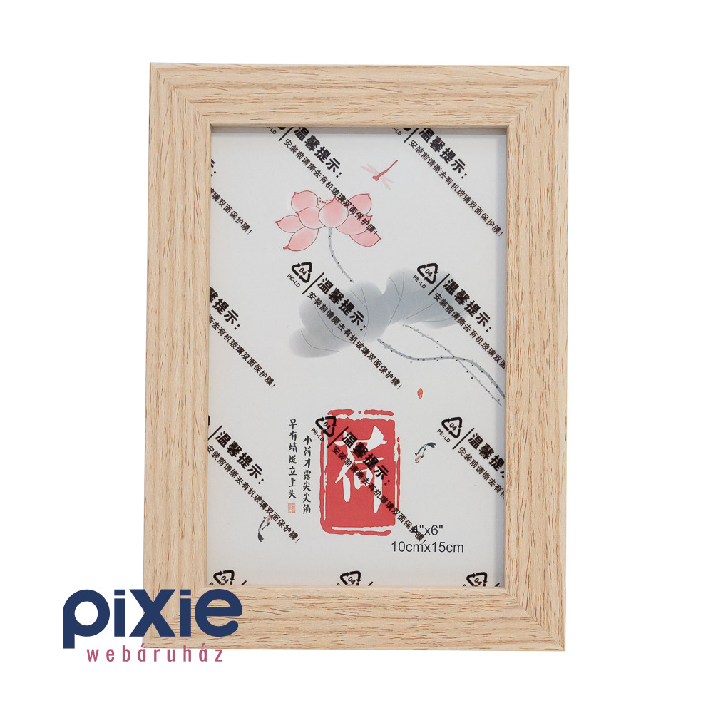 A képkeret natúr fa színű, fa, és műanyag anyagú, és 10cm x 15cm méretű képhez alkalmas.