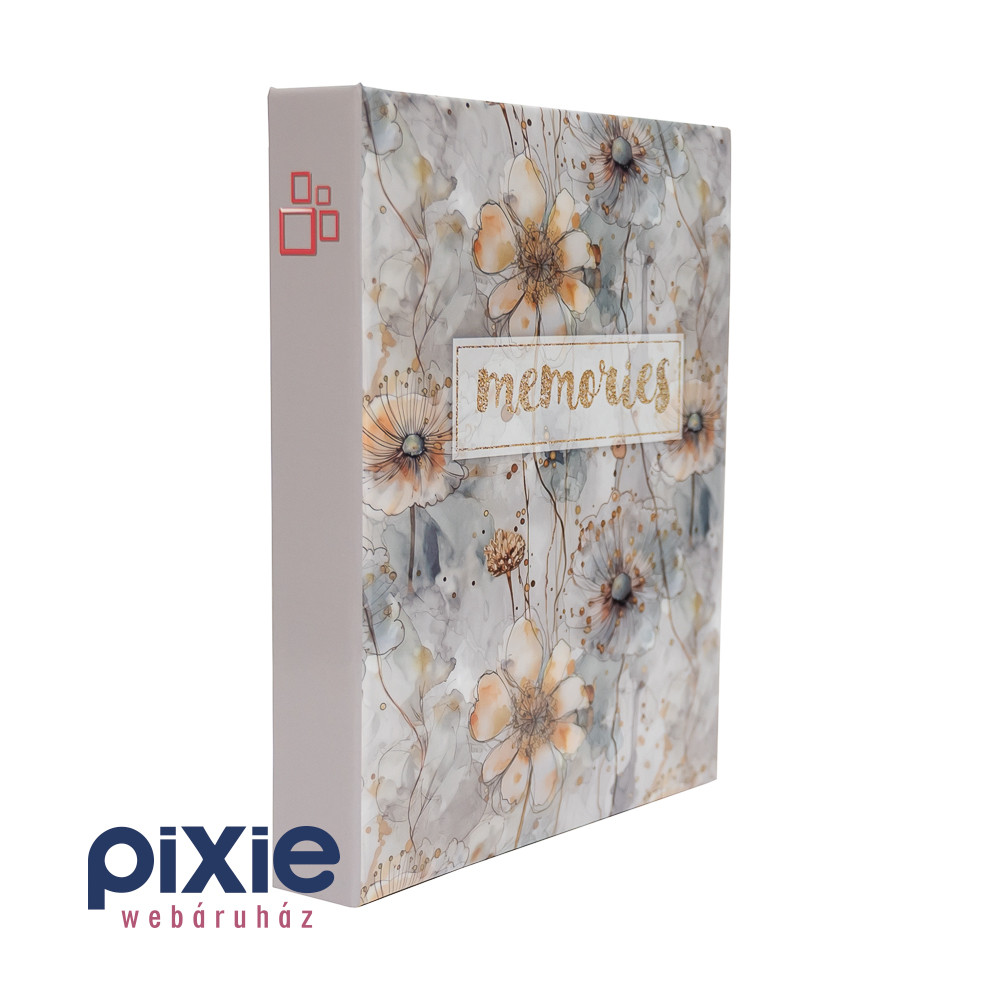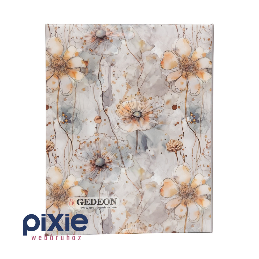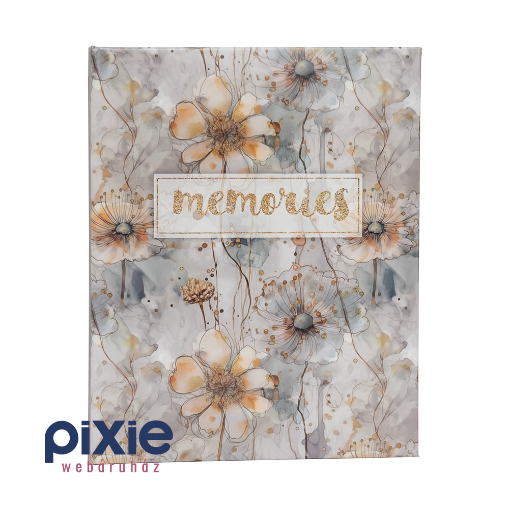 A legszebb emlékek megérdemelnek egy kifinomult, művészi keretet – ez az akvarell stílusú fotóalbum tökéletes választás azoknak, akik értékelik a letisztult szépséget és az érzelmeket. A borítón lágy narancs, kék és szürke virágok bontakoznak ki arany részletekkel, középen pedig csillogó arany felirat hirdeti: emlékek.