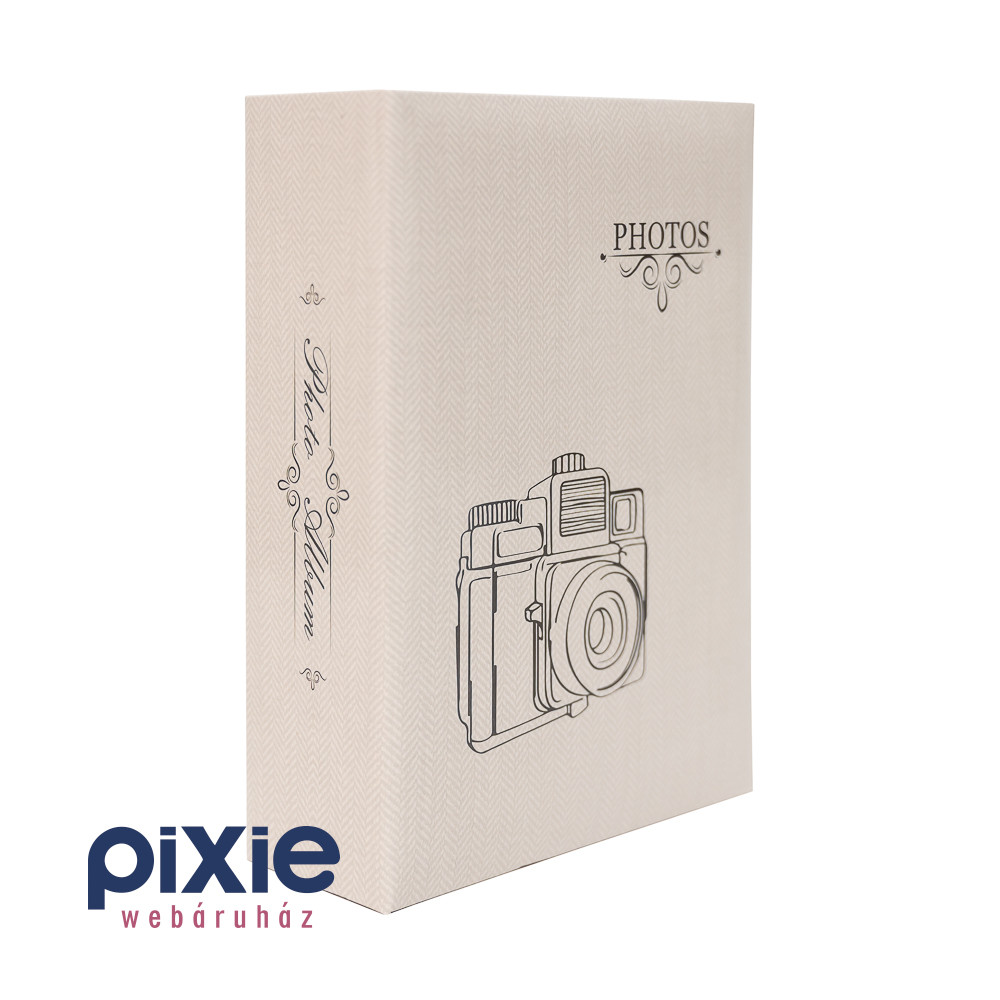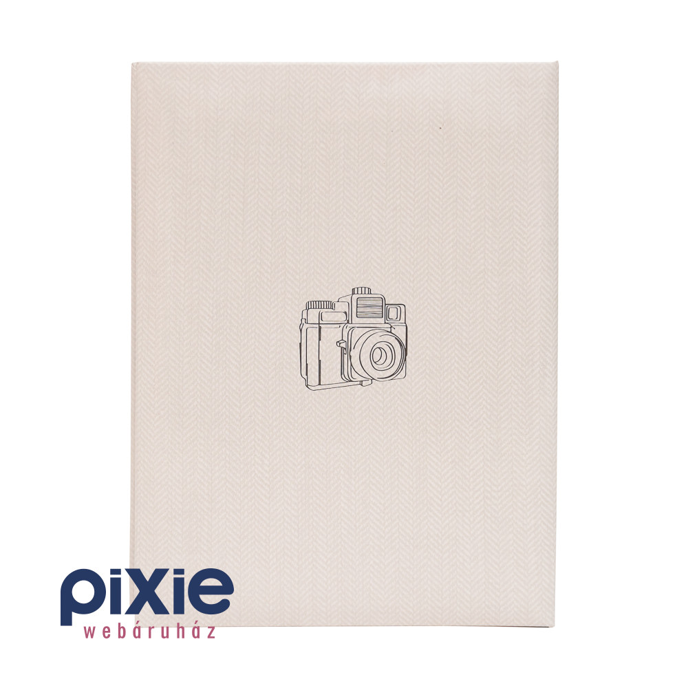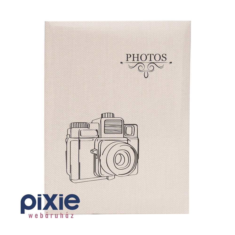 Ez a fotóalbum ideális választás mindazok számára, akik szeretnék méltó módon rendszerezni és megőrizni kedvenc fényképeiket. A borítón található elegáns „PHOTOS” felirat és a finom vonalrajzos vintage kamera grafika modern, mégis nosztalgikus hangulatot teremt. A herringbone mintás háttér diszkrét textúrát ad, amely tovább emeli az album esztétikai értékét.