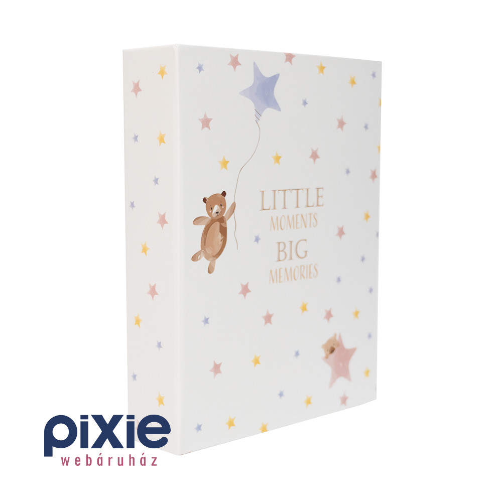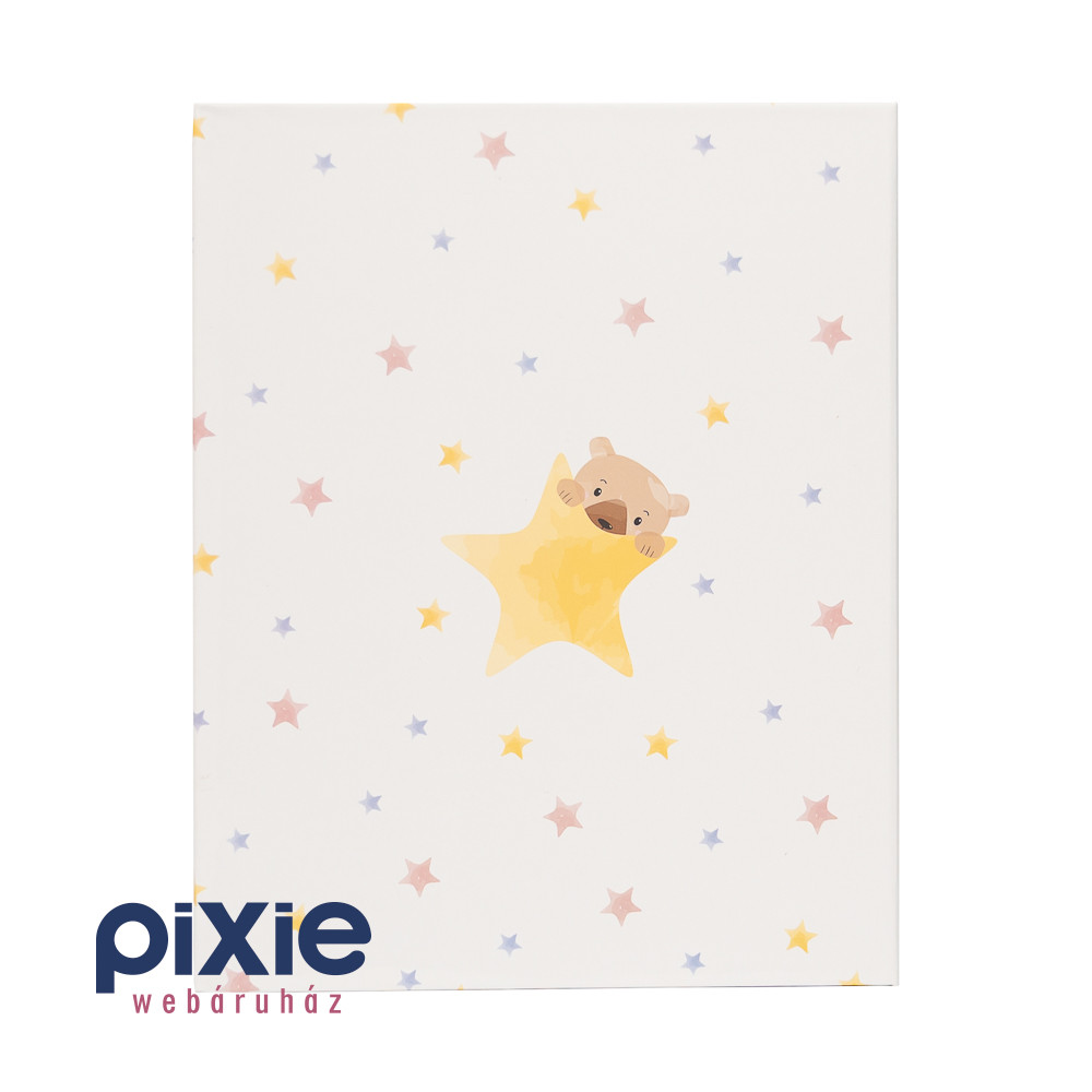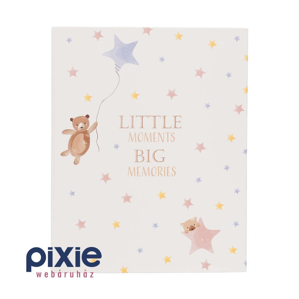 A legapróbb pillanatokból születnek a legnagyobb emlékek – és ez a bájos fotóalbum tökéletes helyet biztosít számukra. A puha pasztellszínek, a csillagmintás háttér és a két kedves maci illusztrációja melegséget és gyengédséget sugároz, így ideális választás kisbabás családoknak, keresztelőre vagy első születésnapra.