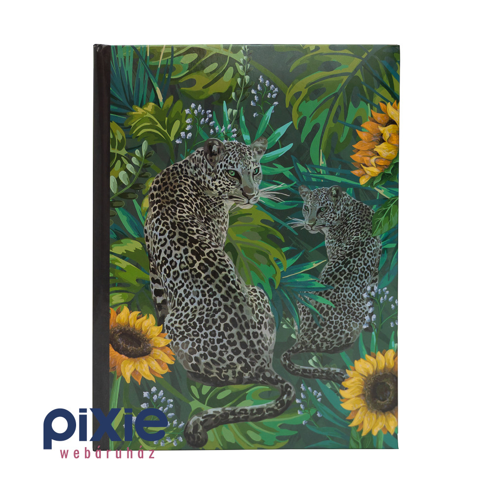 Engedd, hogy emlékeid egy dzsungelbe költözzenek! Ez a különleges fotóalbum két elegáns leopárddal és buja trópusi növényzettel díszített borítót kapott, amely az egzotikus kalandok és a természet szépsége előtt tiszteleg. A napraforgók, lila virágok és zöld levelek vibráló színvilága életet visz a mindennapokba, miközben a részletgazdag illusztráció művészi megjelenést kölcsönöz az albumnak.