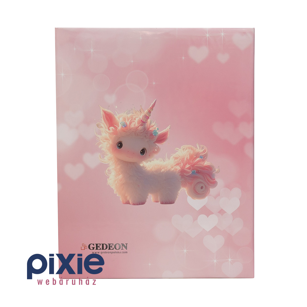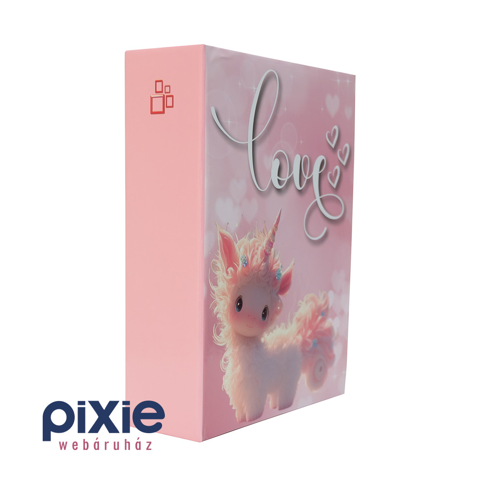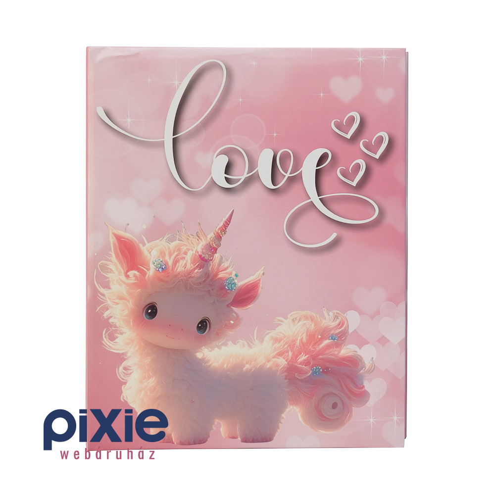 Őrizd meg a legszebb emlékeidet ebben a varázslatos, unikornisos fotóalbumban! A puha rózsaszín árnyalatokkal és csillogó szívekkel díszített borító egy aranyszarvú, göndör sörényű unikornist ábrázol, aki a „love” felirat alatt őrzi a pillanataidat. A nagy, csillogó szemek és a részletgazdag dekoráció igazi mesebeli hangulatot teremtenek.