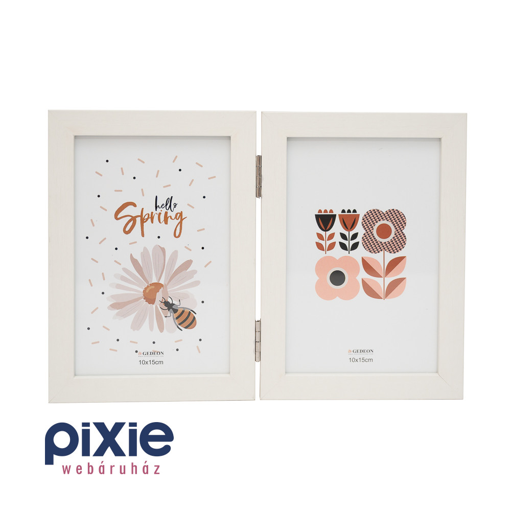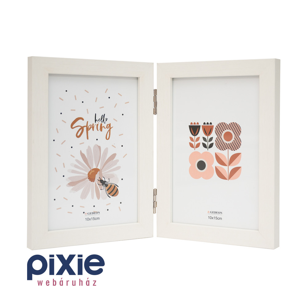 Dobd fel otthonod hangulatát ezzel az elegáns, könyvszerűen szétnyitható dupla képkerettel! A letisztult, fehér keret bármilyen enteriőrbe könnyedén illeszkedik, legyen szó nappaliról, hálószobáról vagy akár irodáról. Két darab 10×15 cm-es fénykép, grafika vagy illusztráció helyezhető bele, így tökéletes választás családi fotókhoz, gyerekek rajzaihoz vagy szezonális dekorációkhoz.