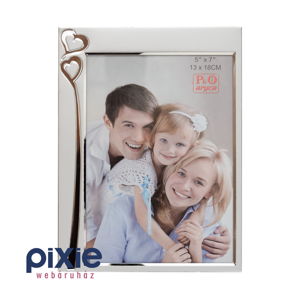 A keret bal oldalán két finoman kidolgozott szív motívum kapott helyet, amelyek gyengéd, szeretetteljes hangulatot kölcsönöznek a dekorációnak. A 13×18 cm-es (5×7”) méret ideális családi fotókhoz, páros képekhez vagy emlékezetes alkalmak megörökítéséhez. Stabil hátlapja és minőségi anyaghasználata biztosítja, hogy a fénykép hosszú éveken át megőrizze szépségét.